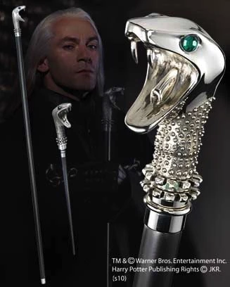 Lucius Malefoy est le père de Drago et l’époux de Narcissa. Il travaille au Ministère de la Magie et est un Mangemort des plus ambitieux.Son bâton à tête de serpent renferme sa baguette magique.Le bâton mesure environ 115 cm et la baguette 25 cm environ. La tête de serpent est plaquée d’argent et sertie de cristaux (strass).