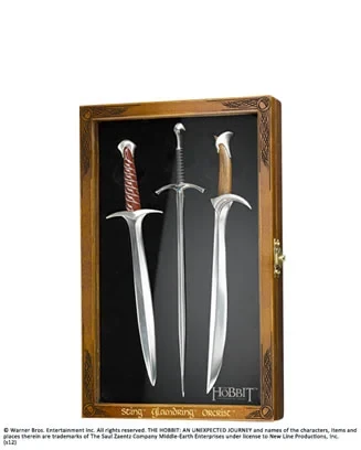 Coffret de 3 ouvre-lettres contenant : Dard, l’épée de Bilbo SacquetGlamdring, l’épée de GandalfOrcrist, l’épée de ThorinLames en acier inoxydable mesurant chacune 20 cm environCoffret en bois vitré (25x16cm env.)Sur celui-ci est inscrit en lettres dorées : ‘Sting Glamdring Orcrist’